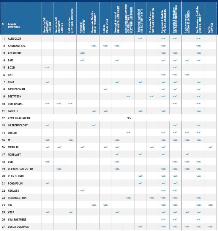 Tutte le aziende dispongono di una qualifica ISO, oltre la metà dispone di Certificazione ISO 9100, indispensabile premessa per accedere alle Qualifiche Aeronautiche. Parte delle Aziende già fornitrici di parti aeronautiche, di conseguenza dispongono delle relative Qualifiche.